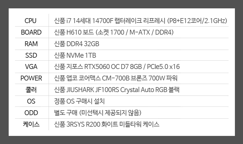 [½Åǰ] ÀÎÅÚ ÄÚ¾î i7 14¼¼´ë ·¦ÅÍ·¹ÀÌÅ© ¸®ÇÁ·¹½Ã 14700F 32G ÁöÆ÷½ºRTX5060 NVMe SSD1TB Áö¿ì¼¡ JF100RS Äð·¯ ±âº»ÀåÂø